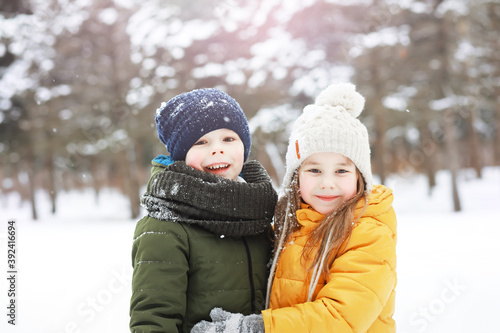 Happy family playing and laughing in winter outdoors in the snow. City park winter day.