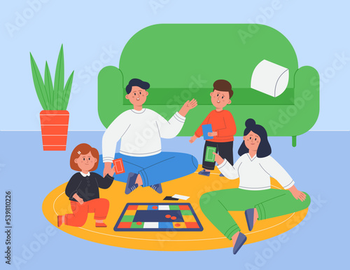Happy family playing hobby game at home flat vector illustration. Mother, father, son and daughter sitting on floor in living room, having fun together. Board game concept