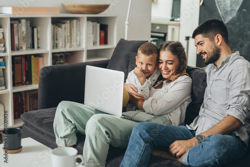 happy family relaxing on sofa at home and using computer
