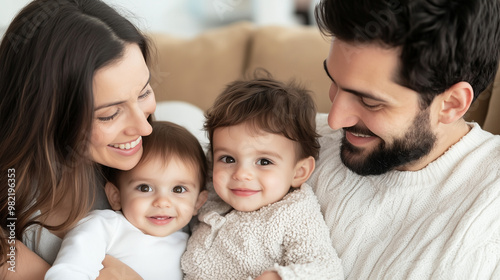 Happy family sitting together on a cozy couch, parents holding their two young children, warm living room setting with natural light, joyful family bond, copy space