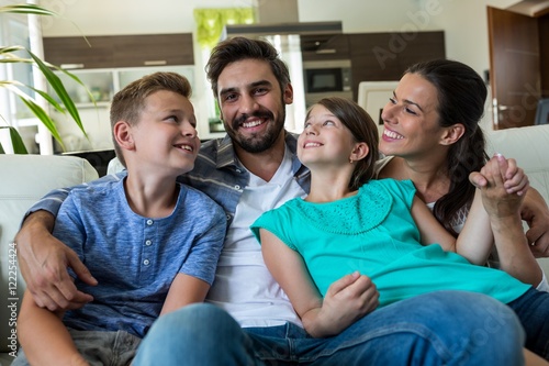 Happy family sitting with arm around on sofa