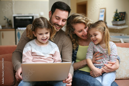 Happy family spending time at home and looking on the laptop. Family spending time at home together.