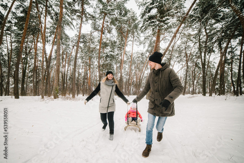 Happy family with daughter having fun in winter forest. Mom, dad, daughter running and walking in the snow in mountains. Father, mother, and child in sled walk and play in the park. Winter holidays.