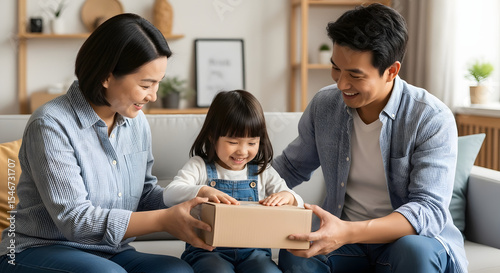 family, young, smiling, receiving, gift, box, happy, living room, bright, modern, cosy, cheerful, indoor, woman, man, children, adorable, joyful, together, celebration, interior, home, happiness, caucasian, female, male, family time, lifestyle, bonding, recreation