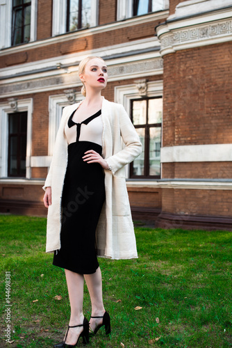 Happy Fashion blonde european elegant Woman with red lips and white skin