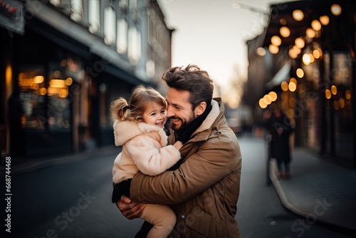happy father and daughter hugging and smiling while spending time together outdoors