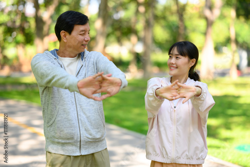 Happy father and daughter stretching and warming up for morning workout in a serene park