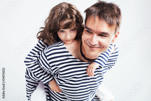 family, people, children, 2, happy, young, cute, white, cheerful, caucasian, casual attire, happiness, fun, attractive, love, father, portrait, adult, son, human relationships, male, boy, together, smile, eltern, togetherness, looking, man, joy, smiling, group, hug, parenthood, laughing, hugs, studio, cuddle, piggyback, little, play, playful, closeup, striped, jersey, t-shirt