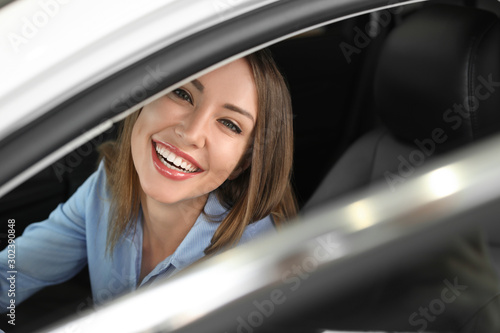 Happy female buyer sitting in new car