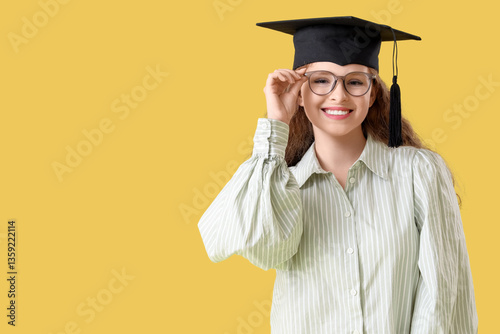 Happy female student in graduation hat on yellow background
