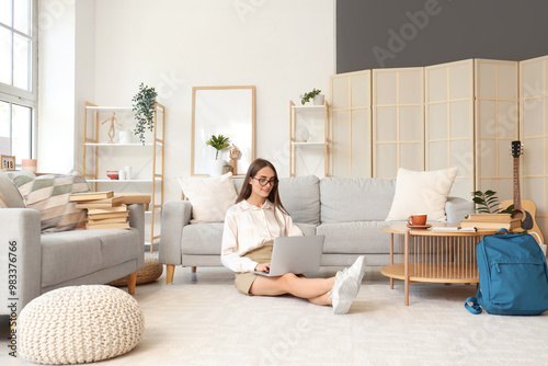 Happy female student with books, cup of coffee and laptop studying at home