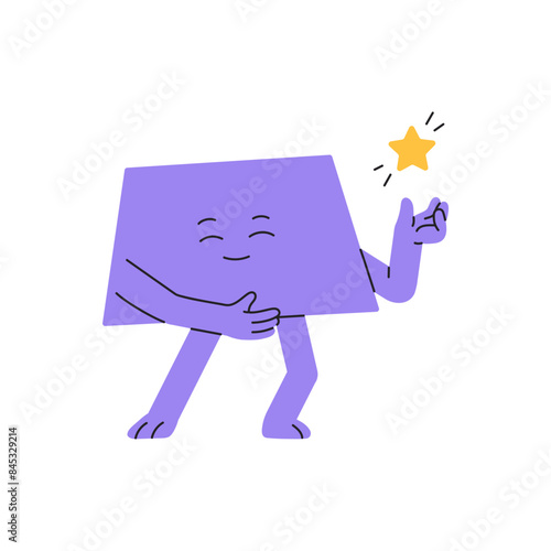 Happy figure shows star, sparkle. Cute geometric character presents new idea, innovation, creative solution. Trapezoid shape with inspiration. Flat isolated vector illustration on white background