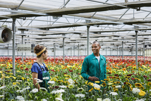 greenhouse, florist, business, gardening, occupation, waist up, flower, abundance, smiling, plant, colleague, gardener, female, horizontal, male, standing, adult, talking, caucasian, daisy, african american, gerbera, young, 30s, 20s, people, 2, day, indoor, men at work, happy, agriculture, nature, working, horticulture, woman, man, childcare center, white, person, adult, grown-up, girl