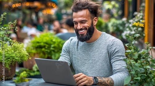 Happy freelancer using laptop outdoors, remote work. Bearded man working remotely in a cafe.