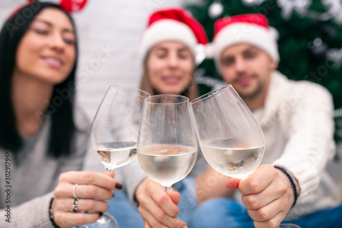 Happy friends celebrating New Year in home interior in Christmas hats sitting near a Christmas tree with glasses of wine. Wine glasses are the focus. Blurred figures of people behind glasses