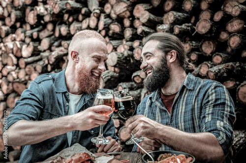 man, male, middle-aged, caucasian, dark-haired, fair hair, bearded, photogenic, strong, beard, friends, beer, ales, toast, drink, drinking, pub, bar, wooden table, wood, firewood, eating, food, dish, plate, conversation, speaking, interesting, having fun, smiling, laughing, waist up