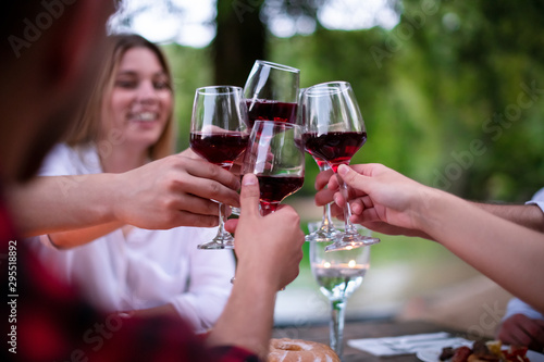 happy friends toasting red wine glass during french dinner party outdoor