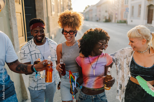 pride, friends, walking, drinking, sunset, diversity, celebration, happy, summer, street, urban, togetherness, community, parade, rainbow, flag, fan, multi, ethnic, cheerful, vibrant, party, fun, social, gathering, youth, lifestyle, friendship, joy, freedom, love, acceptance, equality, oneness, support, solidarity, event, city, fashion, trendy, sunglasses, coiffure, smile