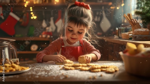 Happy funny little girl bake christmas cookies on cozy kitchen at home . Design ai