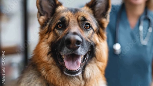 Happy German Shepherd at a veterinary clinic with a smiling veterinarian in the background