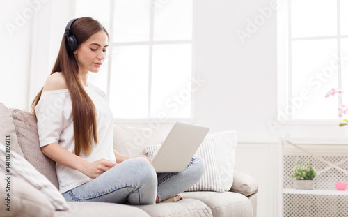 Happy girl in headphones at home. Sitting comfortably on beige sofa using laptop and listening to music with closed eyes. Copy space