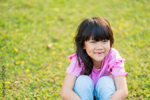 happy girl sitting on the grass, play ground