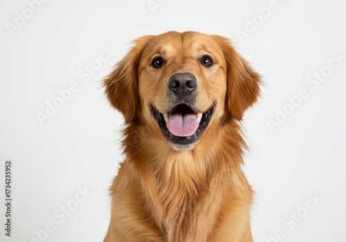 golden retriever, dog, pet, animal, happy, smiling, cheerful, canino, puppy, breed, purebred, studio shot, white background, portrait, head shot, furry, friendly, healthy, companion, mammal, panting, joy, adorable, cute, domestic, loyalty, one animal, front view, studio, nobody, light background, clean, isolated, joyful, expression, brown dog
