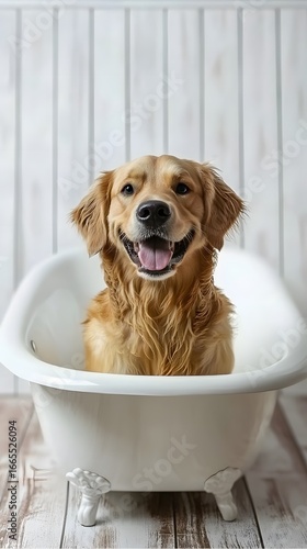 golden retriever, dog, bathe, bathtub, happy, wet, puppy, pet, animal, cute, adorable, funny, playful, portrait, gold, bathroom, clean, laundered, grooming, animal portrait, studio photography, white background, paw, claw, home, interior