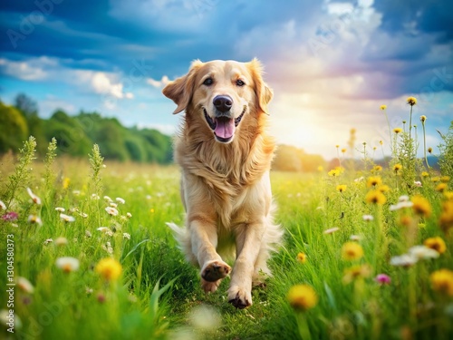 dog, golden retriever, meadow, landscape, summer, dog, puppy, running, happy, field, nature, animal, pet, furry, canino, grass, sun, sky, playful, fun, countryside, rural, scenic, beautiful, wildlife, photo, image, picture, photo, stock, royalty free, animal, pet, retriever