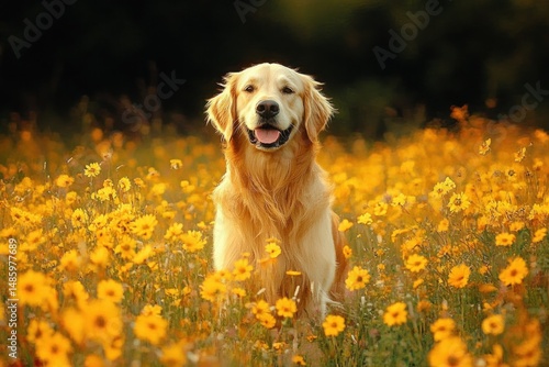 dog, golden retriever, yellow flower, wildflower, flower field, nature, sunlight, golden hour, summer, pet, canino, animal, grass, sunny, warm, bright, cheerful, joyful, closeup, portrait, friendly, companion, spring, seasonal, natural light, playful, beautiful, scenic, pastoral, animal portrait