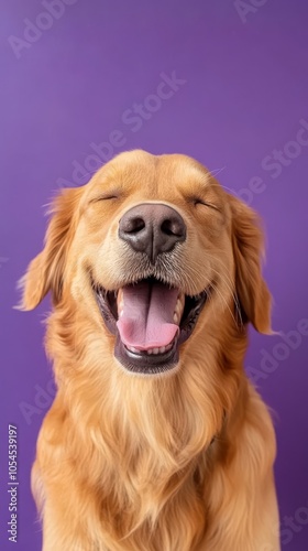 dog, happy, gold, retriever, smile, pet, joyful, canino, portrait, cute, animal, purple background, cheerful, furry, playful, love, young, expressive, whimsical