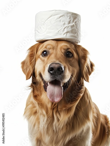 Happy Golden Retriever with a roll of toilet paper perched on its head, facing the lens with a smiley emoticon, full-body pet portrait against a pure white background.