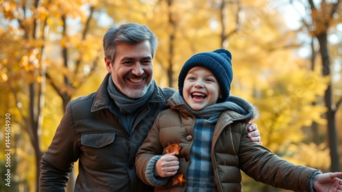 Happy grandfather and grandson enjoy an autumn walk together in a beautiful park filled with golden leaves.