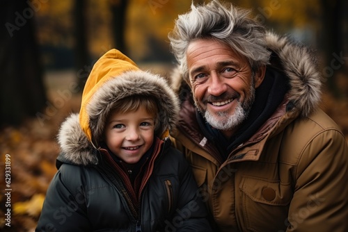 Happy grandfather and grandson hug on autumn walk in park