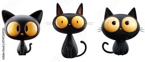 Happy halloween, 3D render Adorable cartoon black cats with large yellow eyes isolated on transparency PNG background, ideal for children's media, Halloween themes, and playful designs