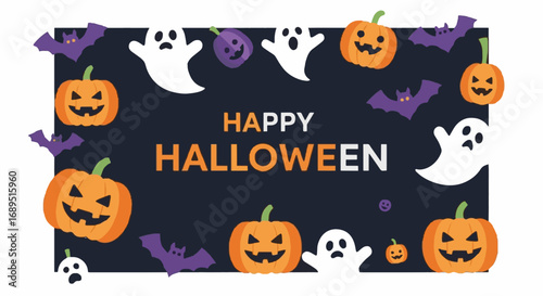 Happy Halloween banner illustration with spooky pumpkins, cute ghosts, and flying bats on a dark background for festive designs.
