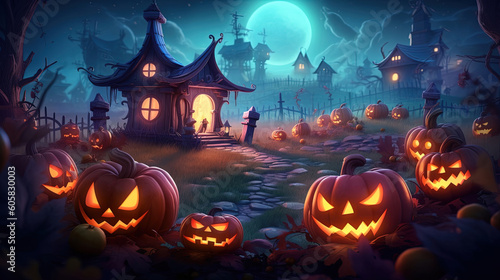 halloween, pumpkin, night, autumn, moon, horror, holiday, bat, illustration, vector, scarey, october, dark, skittish, celebration, orange, evil, design, tree, silhouette, black, card, castle, cartoon, party, generative, ai