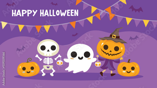 halloween, pumpkin, ghost, skeleton, bat, purple, banner, decor, festive, cute, cartoon, holiday, celebration, skittish, sorcerer, costume, candy, treat, autumn, seasonal, character, fun, illustration, design, party