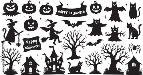 Happy Halloween set of black silhouettes isolated on a white background. Vector illustration