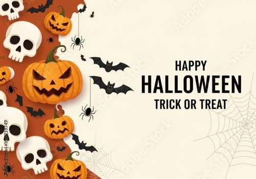 Happy halloween trick or treat with pumpkins, skulls, bats, and spiders on a light background