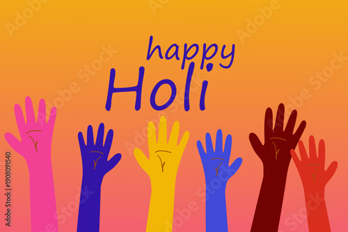 Happy Holi greeting card with colorful raised hands. Flat vector illustration of people celebrating Indian festival of colors on orange gradient background.