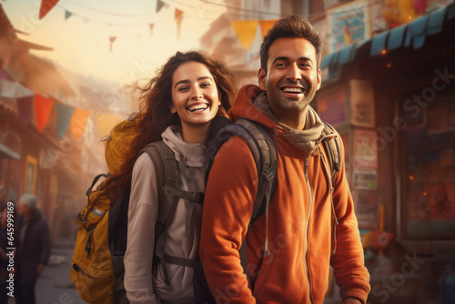 indian, asian, couple, man, woman, male, female, holding, bag, laughing, traveler, two people, life, joy, destination, holiday maker, baggage, tour tourism, looking, suitcase, friends, crazy, smile, jacket, attractive, cheerful, carrying, honeymoon, boyfriend, girlfriend, smiling, street, walk, journey, human relationships, people, outdoors, together, happy, fun, vacation, trip, travel, lifestyle, ai, artificial intelligence, futuristic