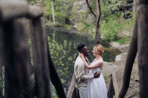 Happy interracial couple newlyweds stands on wooden bridge, embraces and smiles against background of lake and forest.