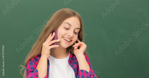 happy kid speaking on smartphone in classroom at blackboard, copy space, conversation