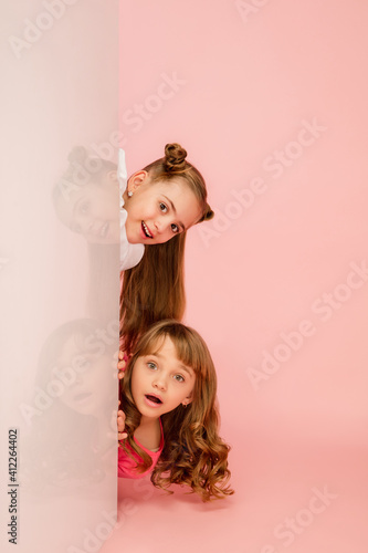 Happy kids, girls isolated on coral pink studio background. Look happy, cheerful. Copyspace for ad. Childhood, education, emotions, business, facial expression concept. Peeking out from behind the