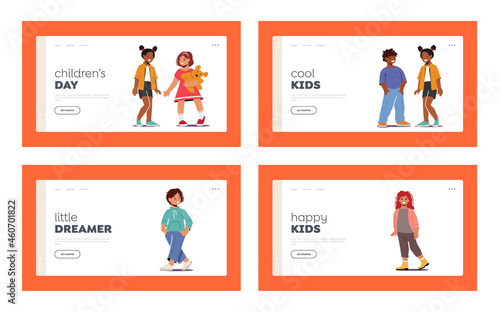 Happy Kids Landing Page Template Set. Smiling Multiracial Boys and Girls Toddlers Characters Wear Fashionable Clothes
