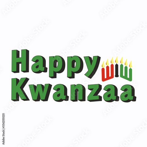 Happy Kwanzaa greeting card with text logo, seven candles in traditional African colors - red, black, green.