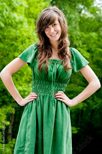 beauty, bright, brown hair, colourful, dress, fashion, fresh, freshness, girl, green, happy, laughing, lifestyle, outdoors, pleasure, smiling, spring, woman, young