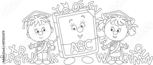 rudiments, book, textbook, alphabet, english, primer, letter, graduate, graduation, prom, holiday, children, children, children, infant, childhood, boy, girl, little, little boy, little girl, school, elementary school, elementary school, preschool, childcare center, nursery school, kindergarten, cartoon, toy, vector, drawing, colouring, black-and-white