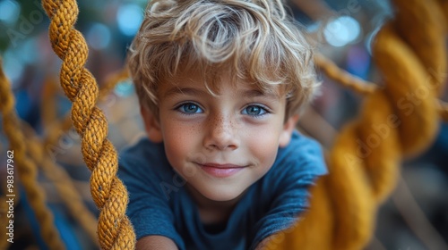 Happy Little Boy Playing on a Rope Playground